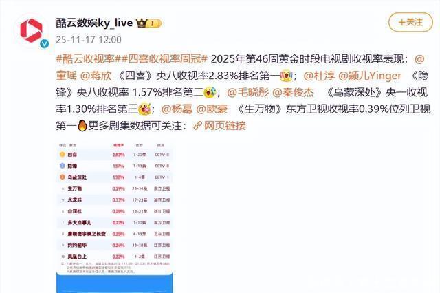 阅读此文之前,麻烦您点击一下“关注”,既方便您进行讨论和分享,又能给您带来不一样的参与感,感谢您的支持。 本文信源来自权威报道:【微博-酷云数娱、百度百科】等(详细信源附在文章末尾)。为提升文章可读性,细节可能存在润色,请理智阅读,仅供参考! 编辑|娱咖 前言 《四喜》这部剧自登陆央视以来,就迅速吸引了观众的目光。